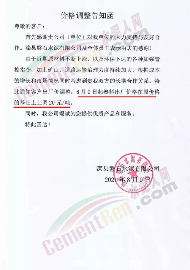 灤縣磐石水泥有限公司通知,由于近期原材料不斷上漲,以及環(huán)保下達的各種加強管控指令,加上礦山、道路運輸治理力度持續(xù)加大,根據(jù)成本的增長和市場情況自8月9日起熟料出廠價格在原價格的基礎上上調(diào)20元/噸。