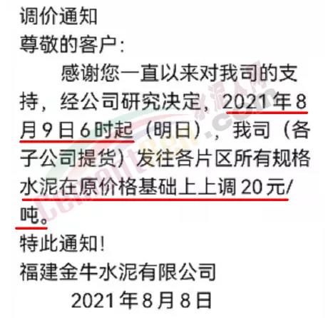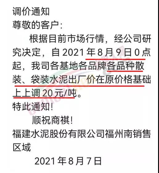 同日福建省內(nèi)福建水泥、金牛水泥等多家企業(yè)通知自8月9日起上調(diào)水泥價格20元/噸。