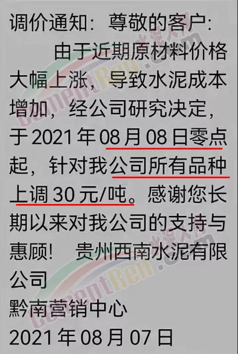 貴州西南水泥有限公司黔南營銷中心通知,由于近期原材料價格大幅上漲,導致水泥成本增加,經(jīng)公司研究決定8月8日零點起,所有品種上調(diào)30元/噸。