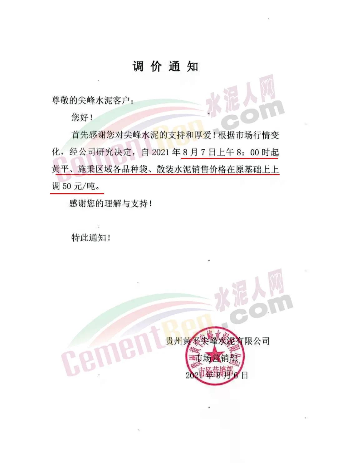 貴州黃平尖峰水泥有限公司市場營銷部通知根據(jù)市場行情變化,經(jīng)公司研究決定,自2021年8月7日上午8時起黃平、施秉區(qū)域各品種袋、散裝水泥銷售價格在原基礎上上調(diào)50元/噸。
