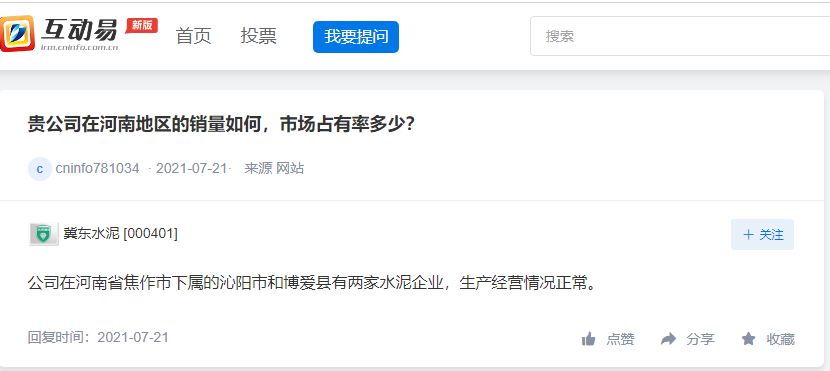 據(jù)水泥人網(wǎng)了解,此前有投資者在上市公司平臺(tái)向冀東水泥提問(wèn)題,公司在河南地區(qū)的銷量如何,市場(chǎng)占有率多少?上市公司回復(fù)稱,“公司在河南省焦作市下屬的沁陽(yáng)市和博愛(ài)縣有兩家水泥企業(yè),生產(chǎn)經(jīng)營(yíng)情況正常。”