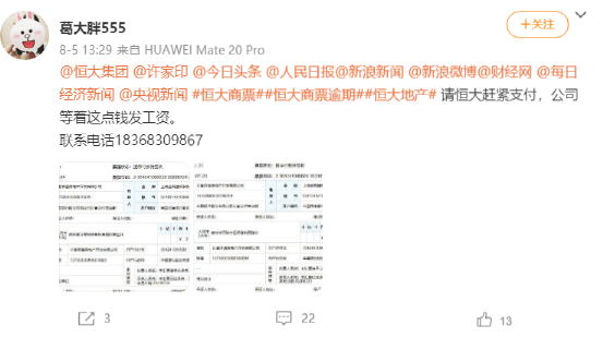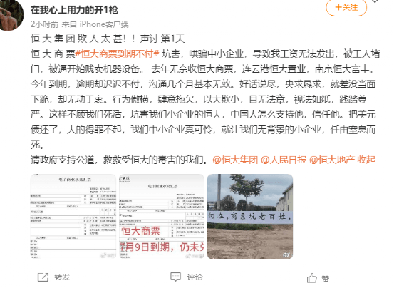 有網(wǎng)友在社交平臺(tái)上留言稱(chēng),恒大商票到期未付,令企業(yè)工資無(wú)法發(fā)出,被工人堵門(mén),被逼賤賣(mài)機(jī)器設(shè)備。去年無(wú)奈收恒大商票,連云港恒大置業(yè),南京恒大富豐。今年到期,逾期卻遲遲不付,溝通幾個(gè)月基本無(wú)效。