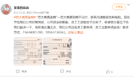 有網(wǎng)友反應(yīng)他公司收到客戶(hù)給的商業(yè)承兌匯票,出票人是“廣寧縣景遠(yuǎn)置業(yè)有限公司”,票面到期日是2021年7月10日,可截止8月6號(hào)仍然沒(méi)有收款付款,而且中間連續(xù)多次提交付款請(qǐng)求均遭到廣寧縣景遠(yuǎn)置業(yè)有限公司拒付。同時(shí)他還收到上游供應(yīng)商給的恒大園林集團(tuán)有限公司、寧波御都置業(yè)有限公司、連云港恒鵬置業(yè)有限公司的商票,這幾家公司都是恒大集團(tuán)的全資子公司。恒大園林已到期已經(jīng)拒付了兩次。合計(jì)共收到恒大84萬(wàn)多商票,本來(lái)等著商票到期支付后把銀行的貸款還了,而如今慘遭恒大拒付,導(dǎo)致資金斷裂,生意也辦法做了。