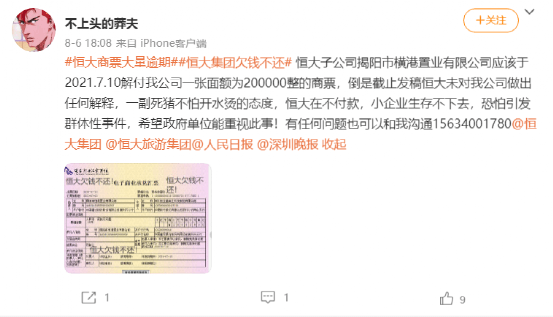 “恒大子公司揭陽(yáng)市橫港置業(yè)有限公司一張面額20萬(wàn)的商票到期未付,未給予任何解釋。"