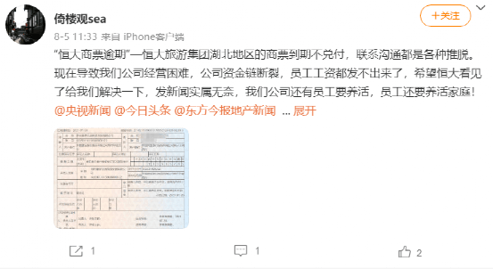 另一網(wǎng)友提到,“河北恒大嚴(yán)重逾期,展期承諾準(zhǔn)時(shí)付款,卻仍然延期不付,公司已經(jīng)被拖累好幾個(gè)月發(fā)不出工資,瀕臨倒閉。”