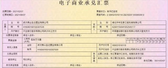 另一持票人爆料,一張出票人為奧山置業(yè)旗下子公司武漢奧山圣達(dá)置業(yè)有限公司的商票已于8月6日逾期尚未兌付。收票人為湖北中科宏泰工程機(jī)械有限公司,出票日期2021年2月7日,匯票到期日2021年8月7日,持票周期半年。票面金額50萬(wàn)元。