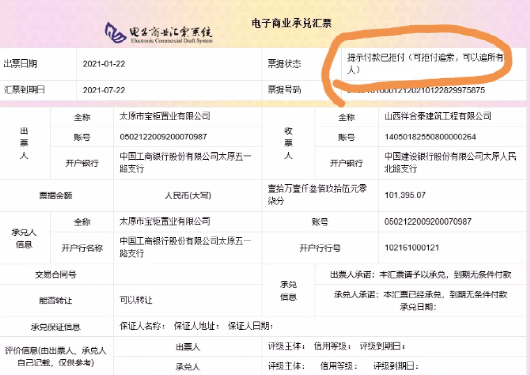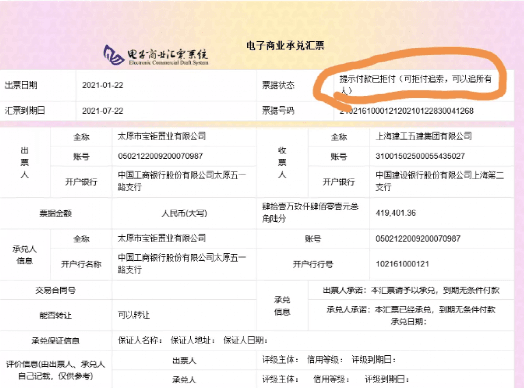 同時(shí),其還曬出了兩份商業(yè)承兌匯票的截圖,金額分別為40多萬(wàn)和10多萬(wàn),出票人均顯示為太原市寶鉅置業(yè)有限公司,出票時(shí)間為2021年1月22日,到期日為2021年7月22日。票據(jù)狀態(tài)為“提示付款已拒付”。