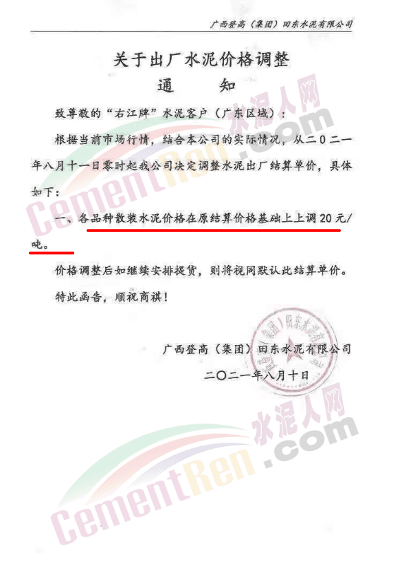 水泥人網(wǎng)通訊員消息:8月10日,廣西登高(集團(tuán))田東水泥有限公司通知根據(jù)當(dāng)前市場(chǎng)行情,結(jié)合公司的實(shí)際情況,從8月11日零時(shí)起公司決定調(diào)整廣東區(qū)域水泥出廠結(jié)算單價(jià)。各品種散裝水泥價(jià)格在原結(jié)算價(jià)格基礎(chǔ)上上調(diào)20元/噸。價(jià)格調(diào)整后如繼續(xù)安排提貨。