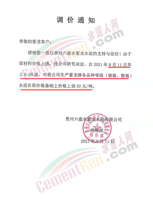 近日,受限電及煤炭漲價(jià)影響,一直處于水泥洼地的貴州省內(nèi)水泥價(jià)格大幅上漲。貴州六盤水豪龍水泥有限公司通知自8月11日早8時(shí)起,對(duì)公司生產(chǎn)的豪龍牌各等級(jí)(袋裝、散裝)水泥在原價(jià)基礎(chǔ)上上調(diào)50元/噸。