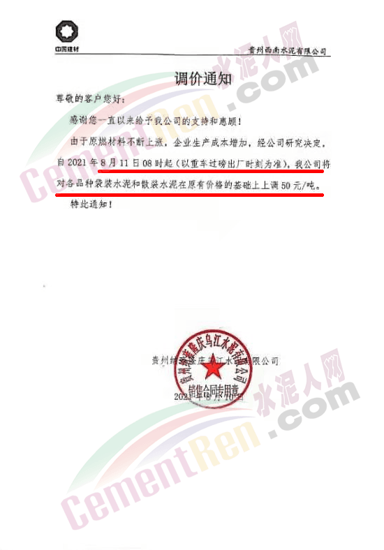 貴州西南水泥通知,由于原燃材料不斷上漲,企業(yè)生產(chǎn)成本增加,經(jīng)公司研究決定,自8月11日8時(shí)起將對(duì)各品種袋裝水泥和散裝水泥在原有價(jià)格的基礎(chǔ)上上調(diào)50元/噸。