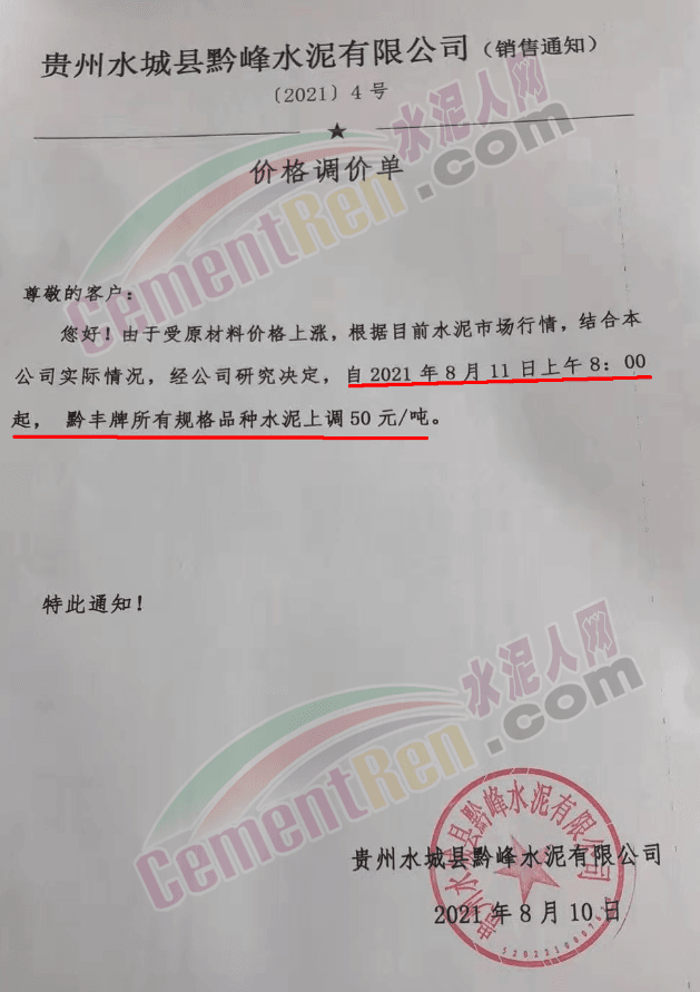 8月10日,貴州水城縣黔峰水泥有限公司通知,由于受原材料價(jià)格上漲,根據(jù)目前水泥市場(chǎng)行情,結(jié)合本公司實(shí)際情況,經(jīng)公司研究決定,自8月11日上午8時(shí)起,黔豐牌所有規(guī)格品種水泥上調(diào)50元/噸。