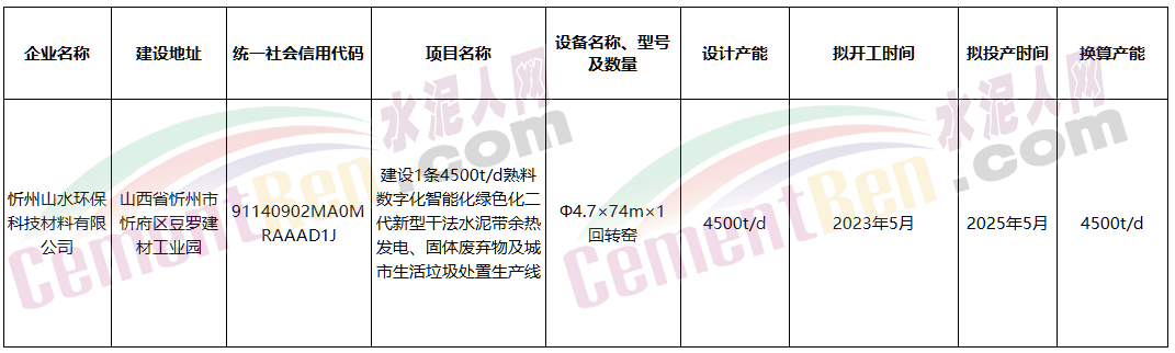 日前,山西省工業(yè)和信息化廳發(fā)布《山西山水水泥有限公司產(chǎn)能情況公示》提到:擬將山西河曲縣中天隆水泥有限公司2500t/d和太原山水水泥有限公司2000t/d水泥熟料產(chǎn)能將退出。用于忻州山水環(huán)保科技材料有限公司在山西省忻州市忻府區(qū)豆羅建材工業(yè)園建設(shè)1條4500t/d熟料數(shù)字化智能化綠色化二代新型干法水泥帶余熱發(fā)電、固體廢棄物及城市生活垃圾處置生產(chǎn)線。開工時(shí)間擬定為2023年5月,擬投產(chǎn)時(shí)間為2025年5月。