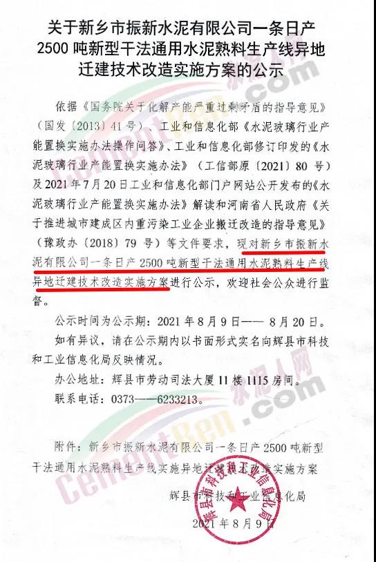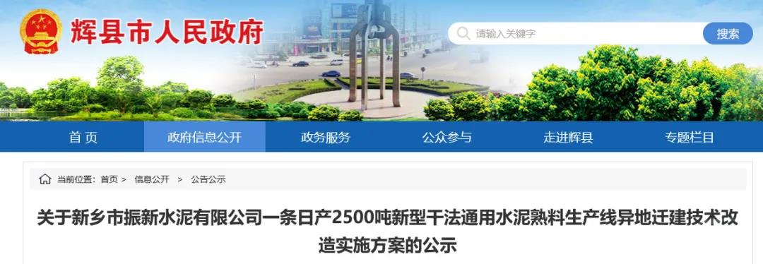 日前,河南新鄉(xiāng)輝縣市人民政府發(fā)布《關(guān)于新鄉(xiāng)市振新水泥有限公司一條日產(chǎn)2500噸新型干法通用水泥熟料生產(chǎn)線異地遷建技術(shù)改造實(shí)施方案的公示》。