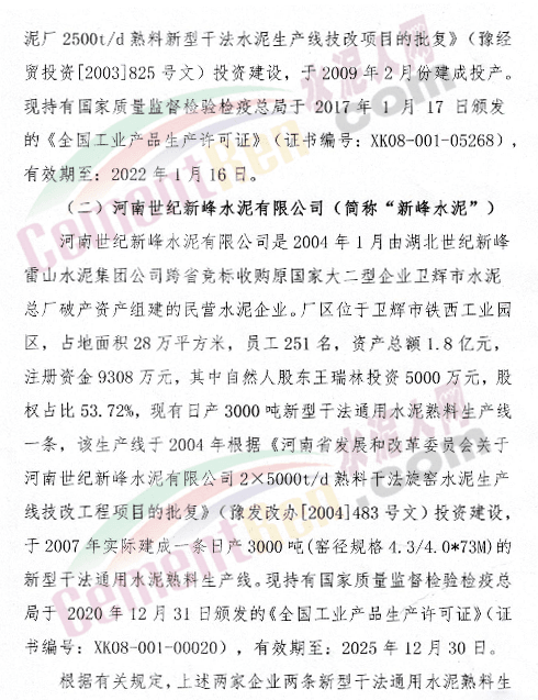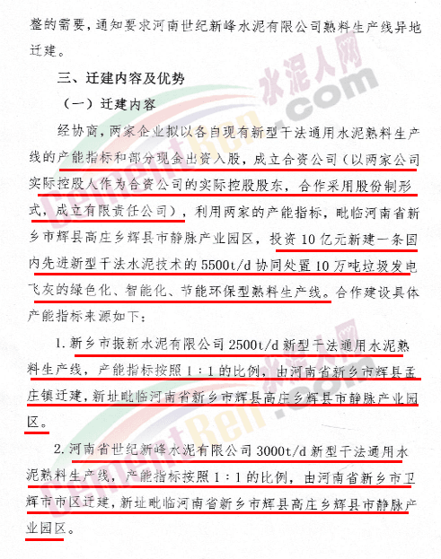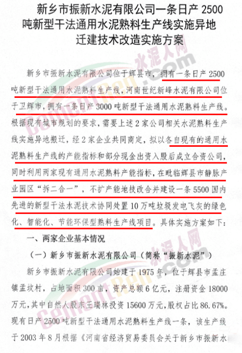 公示文件提到,新鄉(xiāng)市振新水泥有限公司與河南世紀(jì)新峰水泥有限公司擬投資10億元,以各自現(xiàn)有的通用水熟料生產(chǎn)線的產(chǎn)能指標(biāo)和部分現(xiàn)金出資入股后成立合資公司,同時(shí)利用兩家現(xiàn)有通用水泥熟料產(chǎn)能指標(biāo),在毗臨輝縣市靜脈產(chǎn)業(yè)園區(qū)“拆二合一”,不擴(kuò)產(chǎn)能地技改合并建設(shè)一條5500t/d國內(nèi)先進(jìn)的新型干法水泥技術(shù)協(xié)同處置10萬噸垃圾發(fā)電飛灰的綠色化、智能化、節(jié)能環(huán)保型熟料生產(chǎn)線項(xiàng)目。