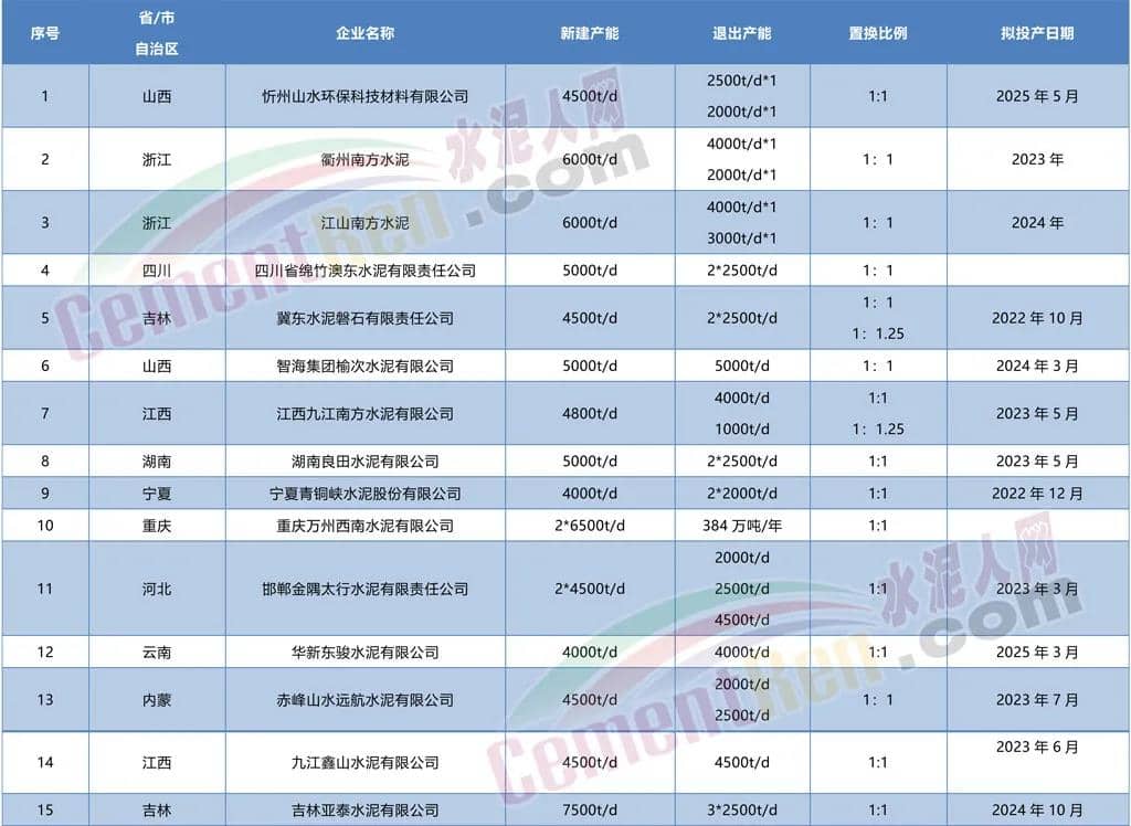 綜合上述置換內(nèi)容,以1:1比例遷建的項(xiàng)目涉及15家水泥企業(yè)17條熟料生產(chǎn)線新建產(chǎn)能合計(jì)2613萬(wàn)噸/年,退出生產(chǎn)線達(dá)28條。