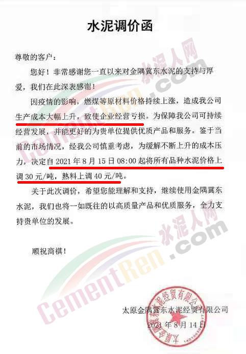 日前,太原金隅冀東有限公司通知因疫情的影響,燃煤等原材料價格持續(xù)上漲,造成公司生產(chǎn)成本大幅上升,致使企業(yè)經(jīng)營虧損。為保障公司可持續(xù)經(jīng)營發(fā)展,并能更好的為客戶提供優(yōu)質(zhì)產(chǎn)品和服務(wù)。鑒于當(dāng)前的市場情況,經(jīng)公司慎重考慮,為緩解不斷上升的成本壓力,決定自2021年8月15日08時起將所有品種水泥價格上調(diào)30元/噸,熟料上調(diào)40元/噸。