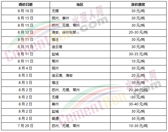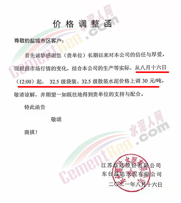 江蘇磊達(dá)水泥通知,根據(jù)市場行情變化,結(jié)合公司生產(chǎn)實際,從8月16日12時起上調(diào)32.5級袋裝及散裝水泥價各30元/噸。