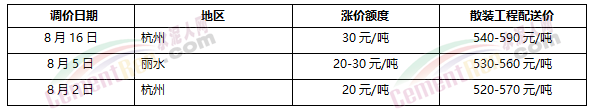 浙江省內(nèi)僅在8月初上調(diào)了部分區(qū)域水泥價格20-30元/噸,其中杭州地區(qū)兩輪連漲,累計上漲50元/噸,上調(diào)后PO42.5散裝工程配送價仍處在540-590元/噸。