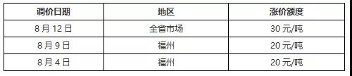 最高漲70元/噸,福建出廠報價最高380元/噸