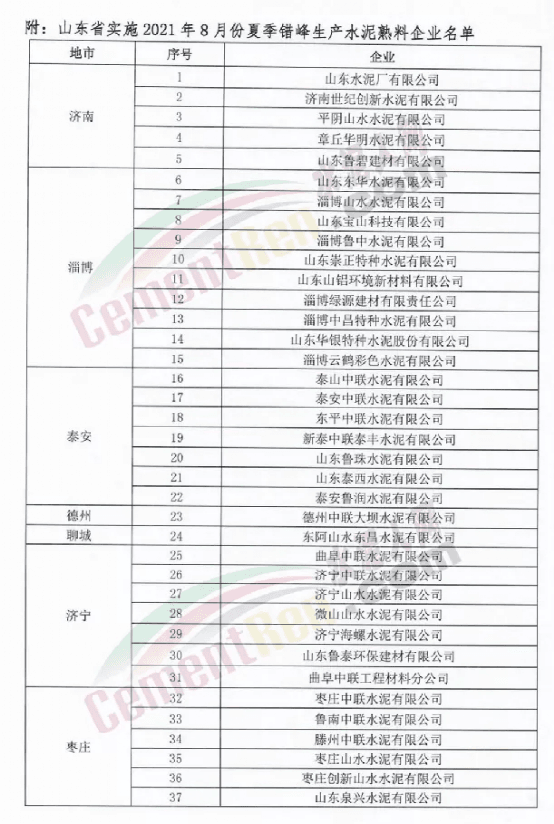 山東省水泥熟料企業(yè)2021年8月份夏季錯(cuò)峰生產(chǎn)的通知要求山東省內(nèi)72家企業(yè)從8月11日0點(diǎn)-8月30日24點(diǎn)停窯限產(chǎn)20天。