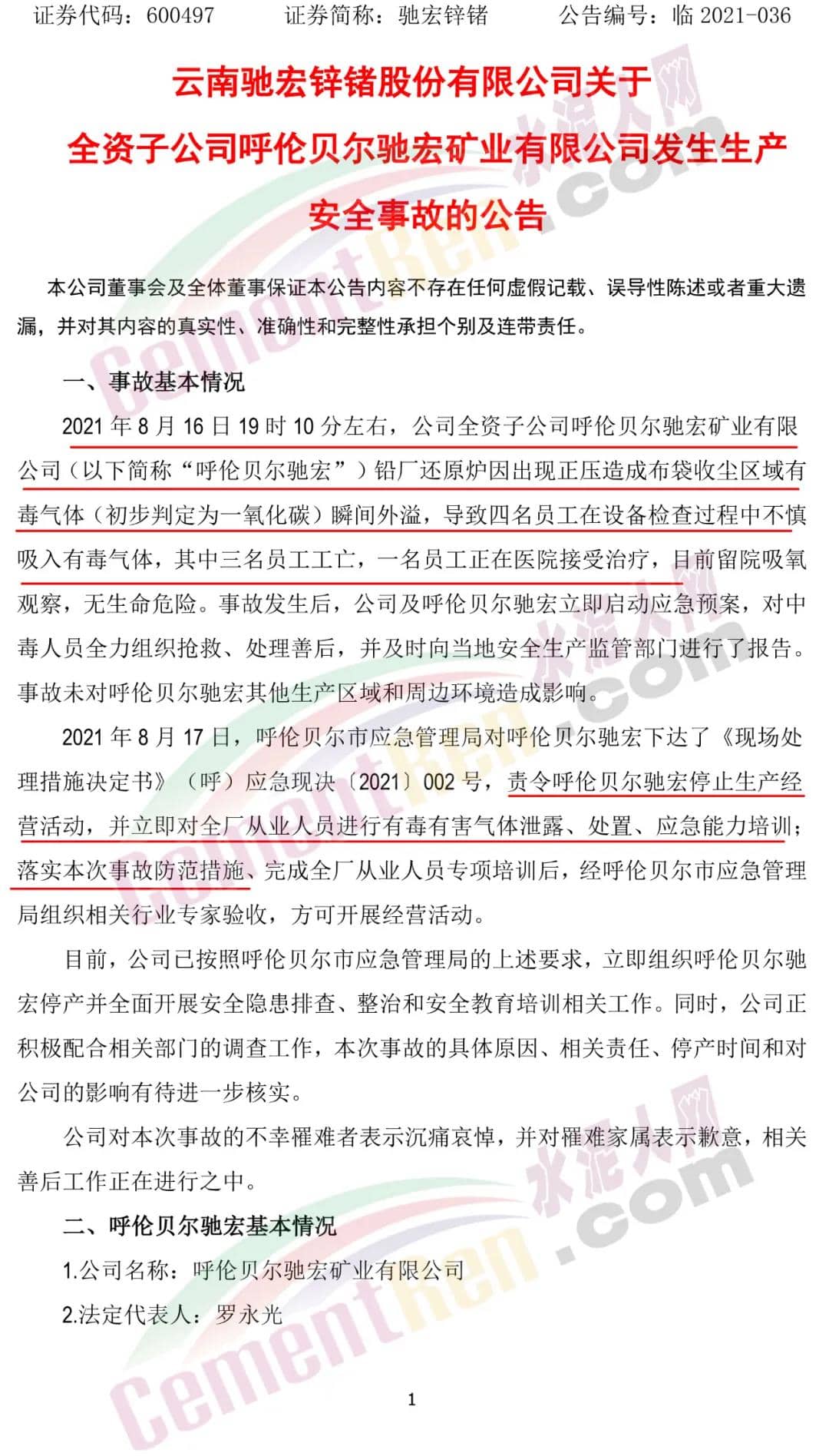 事故發(fā)生后,馳宏鋅鍺及呼倫貝爾馳宏立即啟動應(yīng)急預(yù)案,對中毒人員全力組織搶救、處理善后,并及時向當?shù)匕踩a(chǎn)監(jiān)管部門進行了報告。