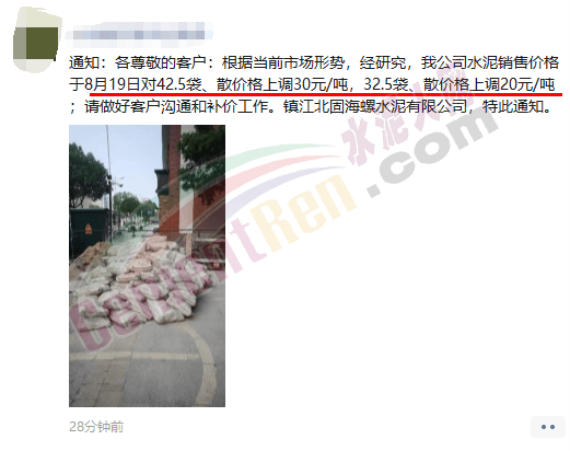 水泥人網(wǎng)通訊員消息:江蘇鎮(zhèn)江北固海螺水泥有限公司通知于8月19日對(duì)42.5袋、散價(jià)格上調(diào)30元/噸,32.5袋、散價(jià)格上調(diào)20元/噸。