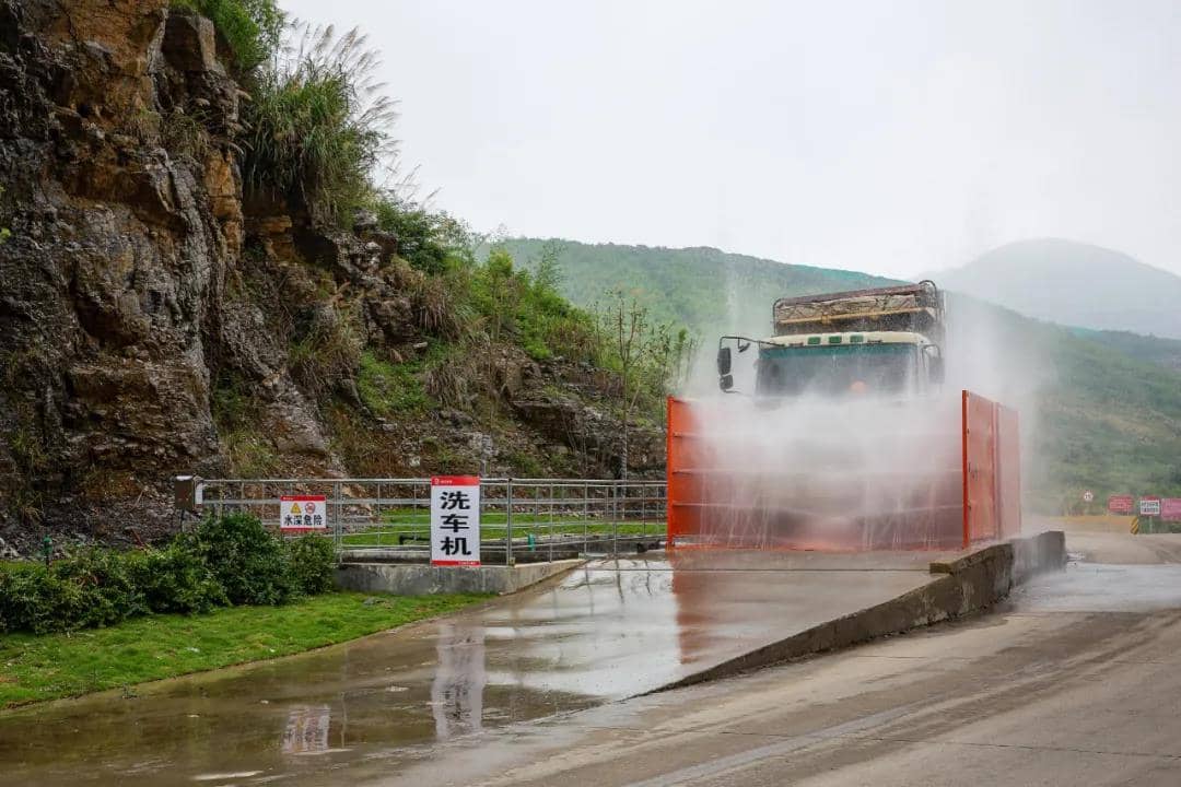 聚焦綠色礦山綜合發(fā)展,天礦堅(jiān)持礦產(chǎn)資源開(kāi)發(fā)領(lǐng)域有序、協(xié)調(diào)、高質(zhì)量發(fā)展,持續(xù)開(kāi)展揚(yáng)塵治理,在礦區(qū)安裝采場(chǎng)噴淋設(shè)施,每當(dāng)?shù)V區(qū)車(chē)輛經(jīng)過(guò),沖洗平臺(tái)便自動(dòng)噴射水流,對(duì)車(chē)身以及輪胎進(jìn)行了全方位沖洗,有效切斷粉塵傳播途徑。