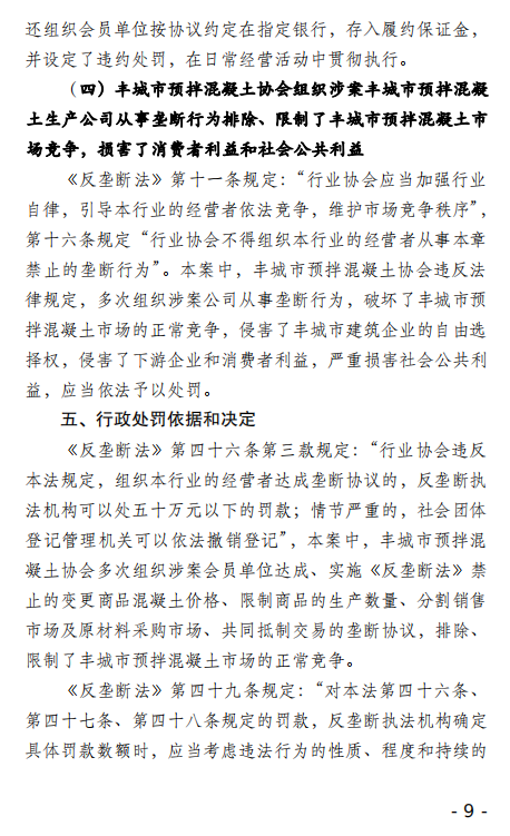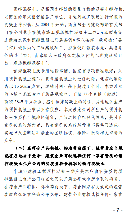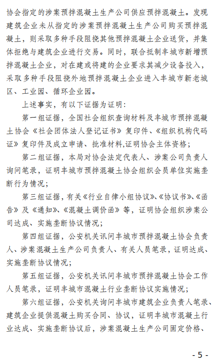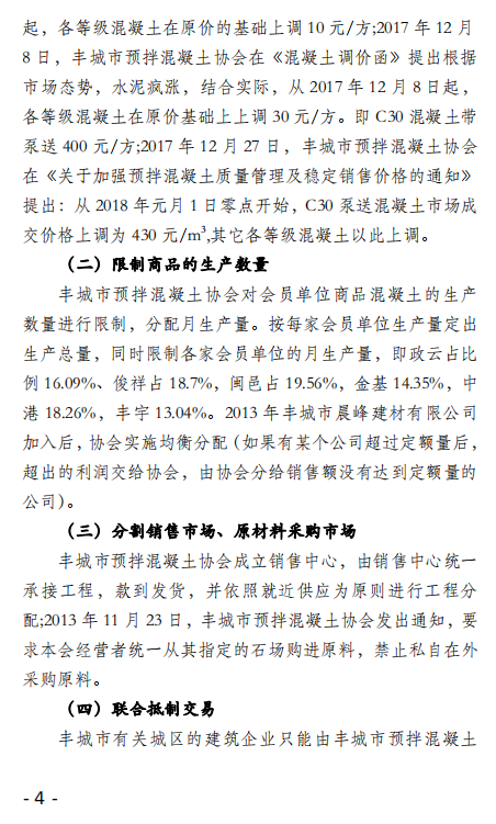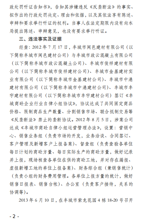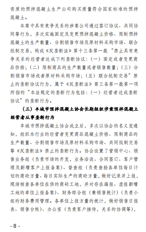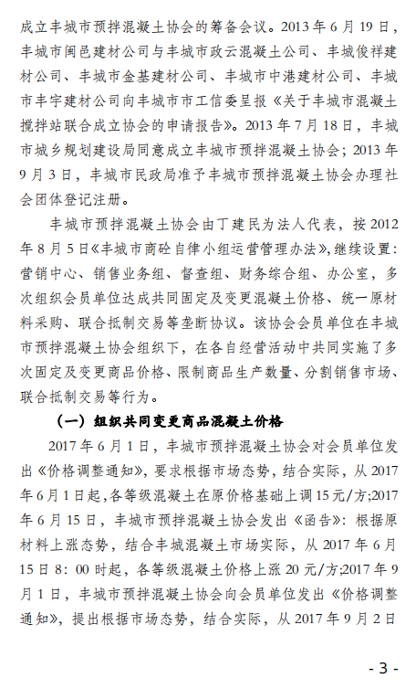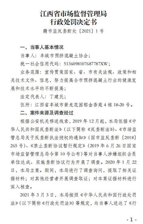 日前,江西省市場(chǎng)監(jiān)管局發(fā)布《豐城市預(yù)拌混凝土協(xié)會(huì)及其會(huì)員企業(yè)壟斷協(xié)議案的處罰決定》根據(jù)公安機(jī)關(guān)移交線索,江西省市場(chǎng)監(jiān)督管理局于2020年1月對(duì)豐城市預(yù)拌混凝土協(xié)會(huì)及其8家會(huì)員企業(yè)涉嫌壟斷協(xié)議行為立案調(diào)查。