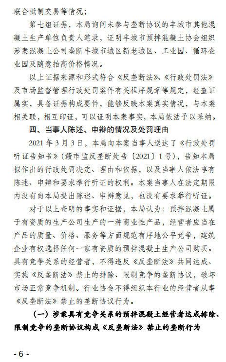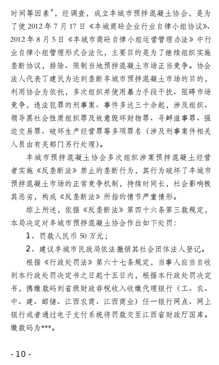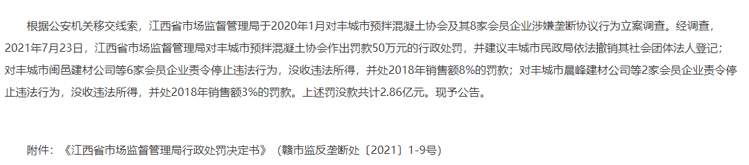 經(jīng)調(diào)查,2021年7月23日,江西省市場(chǎng)監(jiān)督管理局對(duì)豐城市預(yù)拌混凝土協(xié)會(huì)作出罰款50萬(wàn)元的行政處罰,并建議豐城市民政局依法撤銷其社會(huì)團(tuán)體法人登記;對(duì)豐城市閩邑建材公司等6家會(huì)員企業(yè)責(zé)令停止違法行為,沒收違法所得,并處2018年銷售額8%的罰款;對(duì)豐城市晨峰建材公司等2家會(huì)員企業(yè)責(zé)令停止違法行為,沒收違法所得,并處2018年銷售額3%的罰款。上述罰沒款共計(jì)2.86億元。