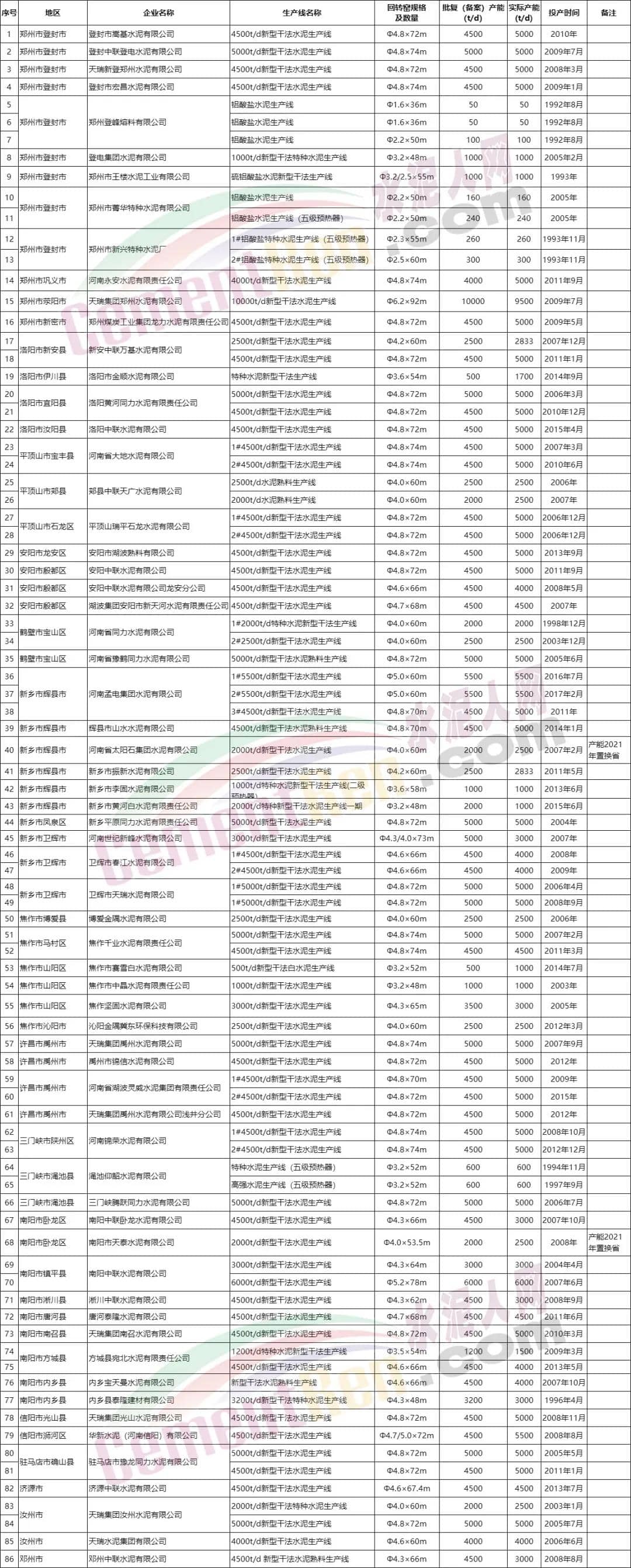 清單顯示,河南省內(nèi)共有86條熟料生產(chǎn)線,批復(fù)(備案)產(chǎn)能合計(jì)達(dá)9202.8萬(wàn)噸/年,實(shí)際產(chǎn)能達(dá)9426.78萬(wàn)噸/年,其中河南省太陽(yáng)石集團(tuán)水泥有限公司和南陽(yáng)市天泰水泥有限公司各一條2000t/d新型干法水泥生產(chǎn)線產(chǎn)能2021年置換省外。