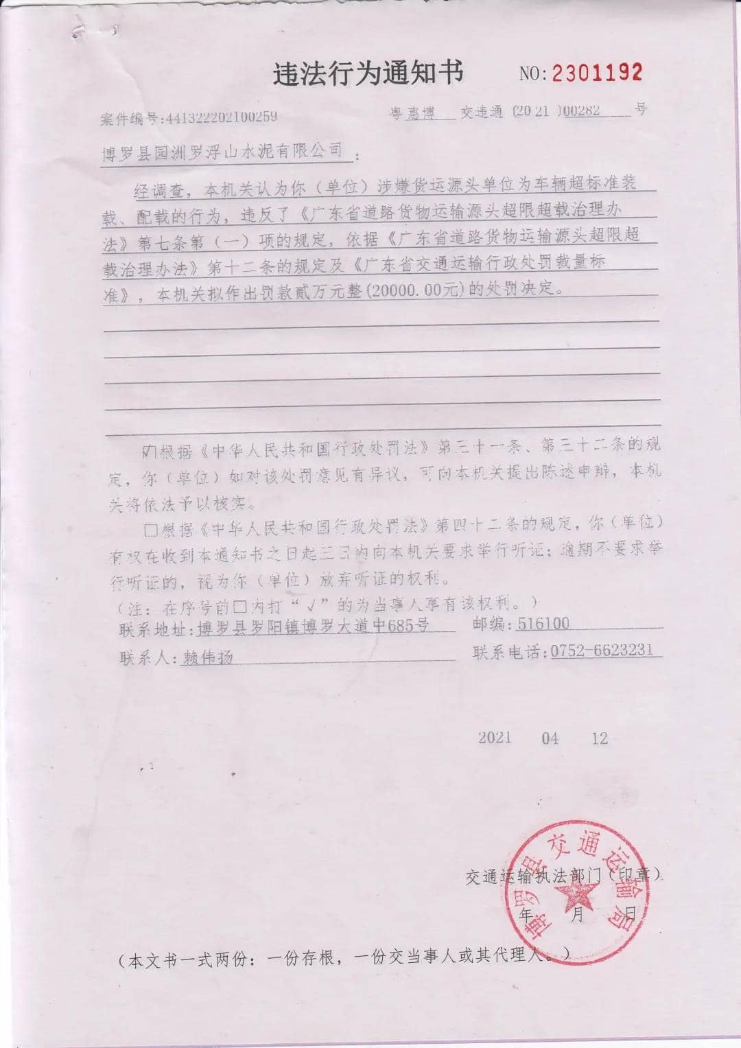 日前,廣州省惠州市博羅縣交通運(yùn)輸局發(fā)布《關(guān)于向博羅縣園洲羅浮山水泥有限公司送達(dá)<違法行為通知書>(惠博交字【2021】00282號)的公告》稱,博羅縣園洲羅浮山水泥有限公司涉嫌貨運(yùn)源頭單位為車輛超標(biāo)準(zhǔn)裝載、配載,依據(jù)相關(guān)規(guī)定,罰款貳萬元整(20000.00元)。具體公告如下: