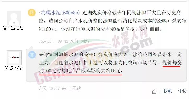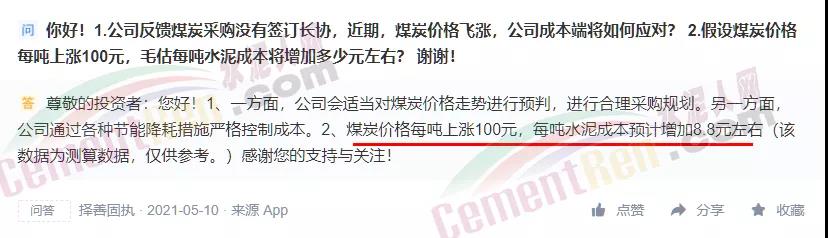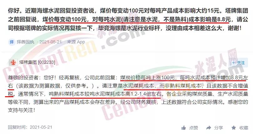塔牌管理層則表示:煤炭價格每噸上漲100元,每噸水泥成本預計增加8.8元左右。且各企業(yè)采購煤炭質量、生產水泥質量等級不同,測算出來的產品煤耗成本會存在差異。