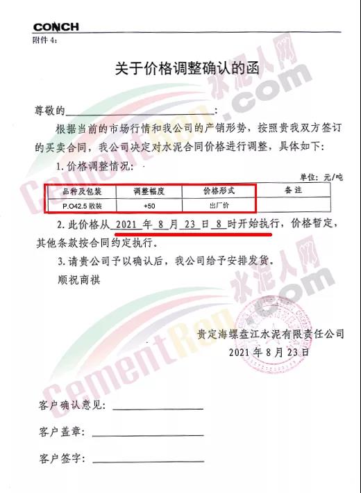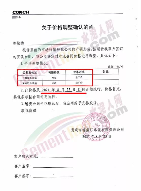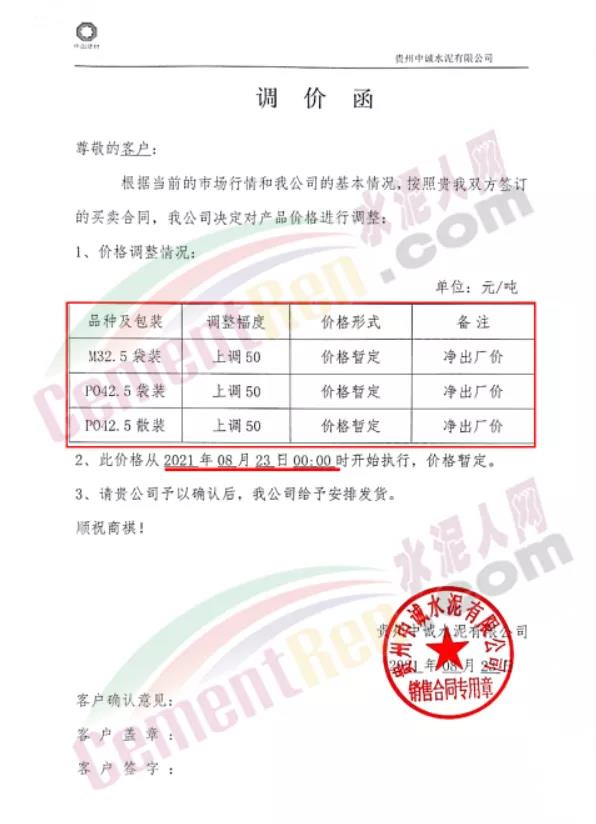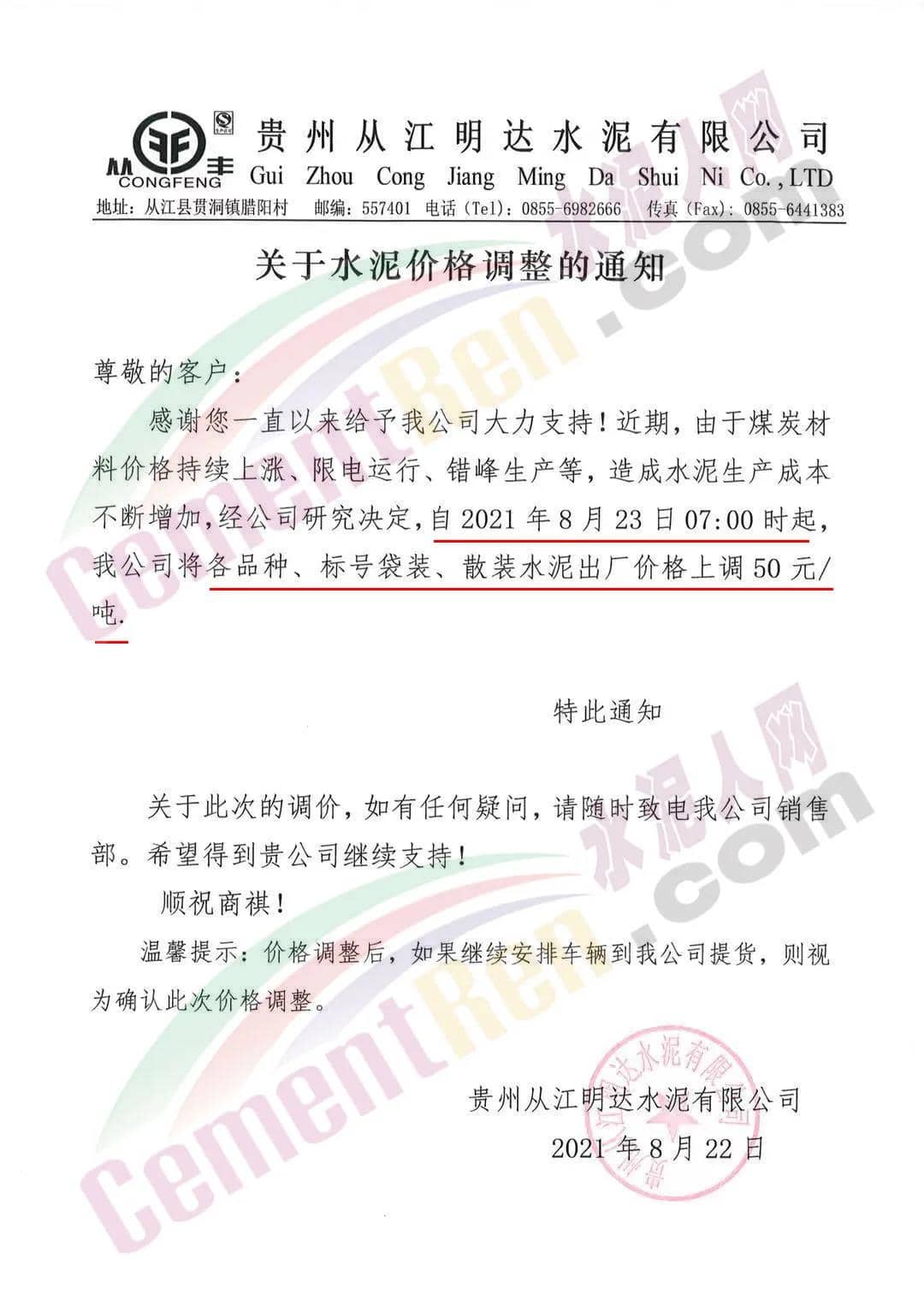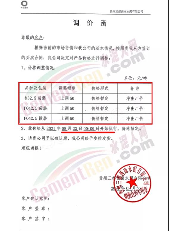 貴州從江明達水泥有限公司通知,由于煤炭材料價格持續(xù)上漲、限電運行、錯峰生產等,造成水泥生產成本不斷增加,經(jīng)公司研究決定,自8月23日7時起公司將各品種、標號袋裝、散裝水泥出廠價上調50元/噸。價格調整后,如繼續(xù)安排車輛到公司提貨,則視為確認此次價格調整。