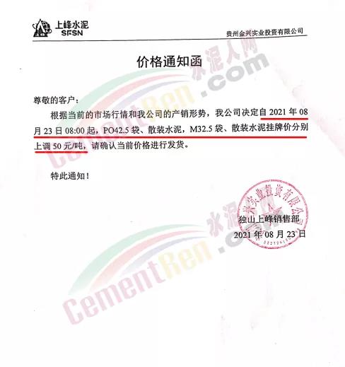 獨山上峰銷售部通知,自8月23日0時起,各標號水泥上調50元/噸。