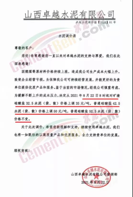 山西卓越水泥有限公司通知,因燃煤等原材料價格持續(xù)上漲,造成公司生產成本大幅上升,致使企業(yè)經(jīng)營虧損,為保障公司可持續(xù)經(jīng)營發(fā)展,經(jīng)公司慎重考慮,為緩解不斷上升的成本壓力,決定從8月22日8時起對礦渣硅酸鹽32.5水泥價格上調35元/噸,普通硅酸鹽水泥42.5價格上調50元/噸。