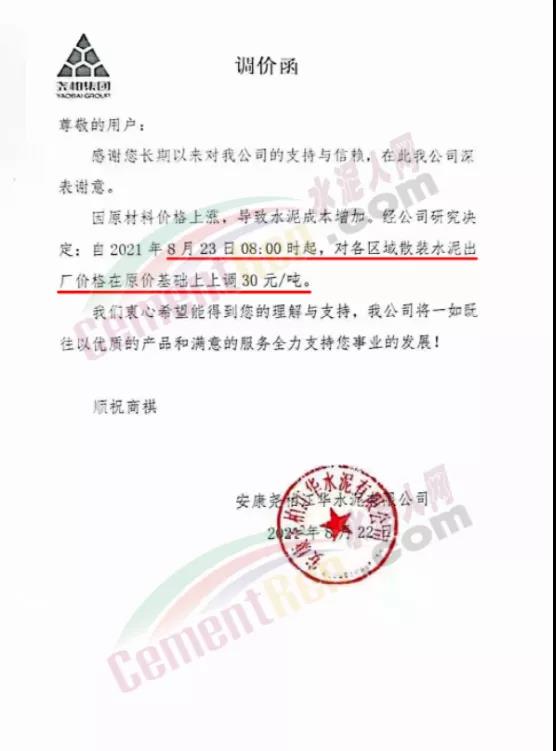 安康堯柏江華水泥有限公司通知,因原材料價格上漲,導致水泥成本增加。經(jīng)公司研究決定,自8月23日8時起,對各區(qū)域散裝水泥出廠價格在原價基礎上上調30元/噸。
