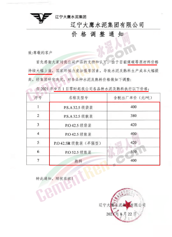日前,遼寧大鷹水泥集團有限公司通知,由于目前煤炭等原材料價格持續(xù)大幅上漲,國家環(huán)保力度加強等因素,導致水泥及熟料生產成本大幅提高,經(jīng)集團研究決定,自9月1日起公司各品種水泥及熟料執(zhí)行最新價格。其中P.O42.5散裝水泥和熟料均執(zhí)行400元/噸。P.O52.5散裝水泥執(zhí)行550元/噸。