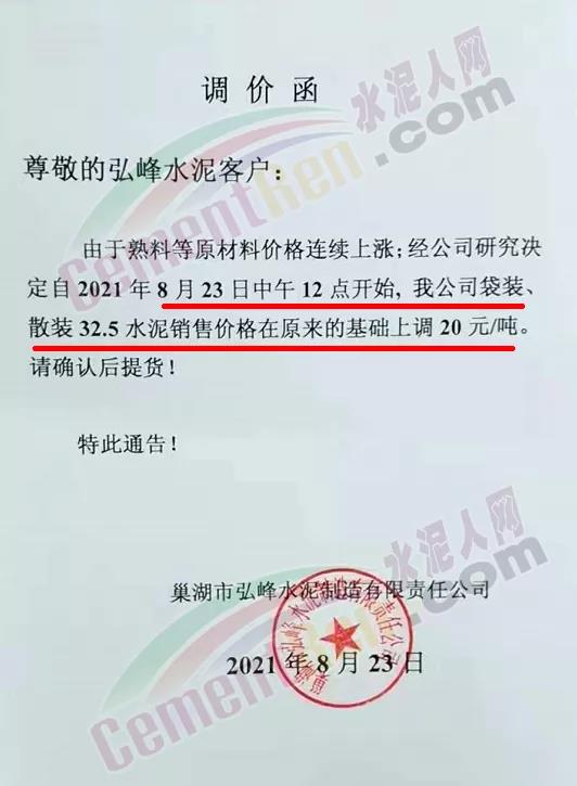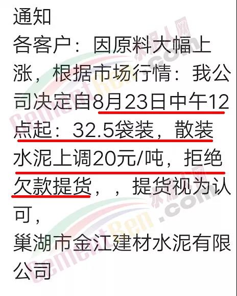 巢湖市金江建材水泥有限公司通知客戶∶因原料大幅上漲,根據(jù)市場行情公司決定自8月23日中午12點起32.5袋裝,散裝水泥上調20元/噸,拒絕欠款提貨,提貨視為認可。
