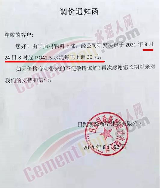 日照明珠新型建材有限公司通知,由于原材料物料上漲,經(jīng)公司研究決定于8月24日起P.O42.5上調30元/噸。