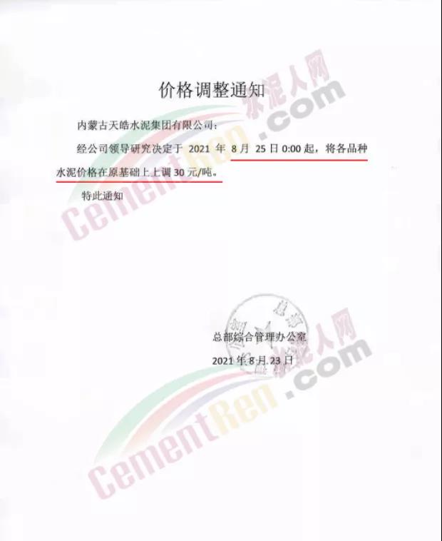 總部綜合管理辦公室通知內蒙古天皓水泥集團有限公司稱,經(jīng)公司領導研究決定于8月25日0時起,將各品種水泥價格在原基礎上上調30元/噸。