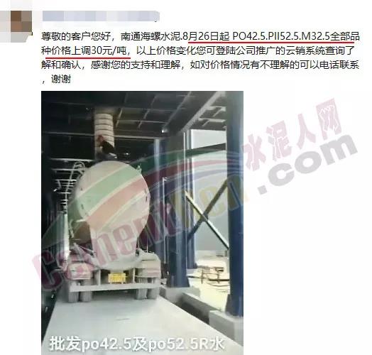 江蘇南通海螺通知,自8月26日起PO42.5、PII52.5、M32.5全部品種價格上調(diào)30元/噸。