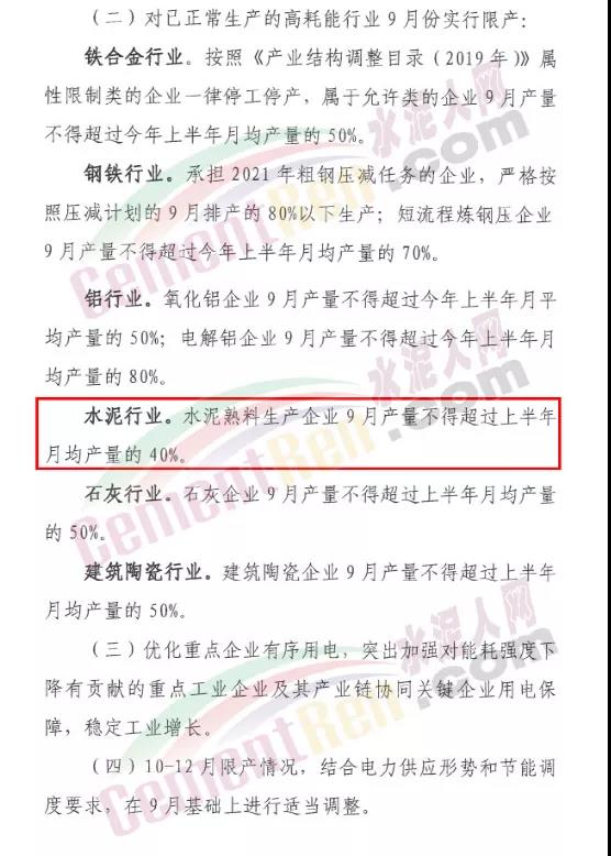 水泥行業(yè)水泥熟料生產(chǎn)企業(yè)9月產(chǎn)量不得超過上半年月均產(chǎn)量的40%。涉及的水泥企業(yè)包括華潤水泥、海螺水泥、南方水泥、紅獅水泥、魚峰水泥、虎鷹水泥、東泥天等、融水東立建材等共41家。