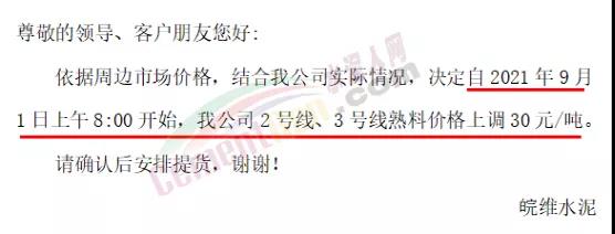 同日,安徽皖維水泥通知,自2021年9月1日上午8:00開始,公司2號線、3號線熟料價格上調(diào)30元/噸。