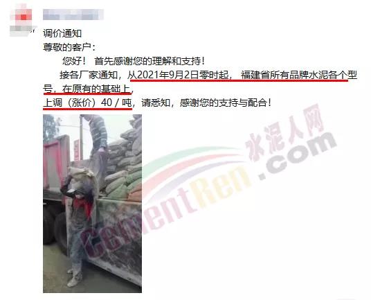有經(jīng)銷商發(fā)通知稱,從9月2日零時起 ,福建省內(nèi)所有品牌水泥各個型號在原有基礎(chǔ)上上調(diào)40元/噸。