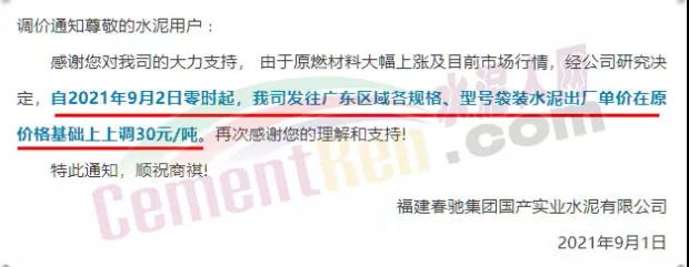 其中,福建春馳集團國產(chǎn)實業(yè)水泥有限公司通知稱,由于原燃材料大幅上漲及目前市場行情,經(jīng)公司研究決定,自2021年9月2日零時起,發(fā)往廣東區(qū)域各規(guī)格、型號袋裝水泥出廠單價在原價格基礎(chǔ)上上調(diào)30元/噸。