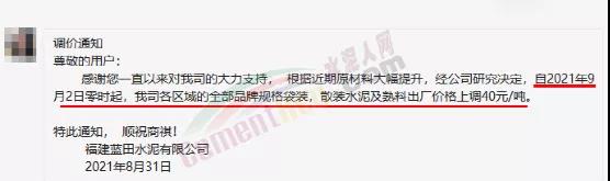 福建藍田水泥通知,因近期原材料大幅提升,經(jīng)公司研究決定,自9月2日零時起,各區(qū)域全部品牌規(guī)格袋裝、散裝水泥及熟料出廠價格上調(diào)40元/噸。