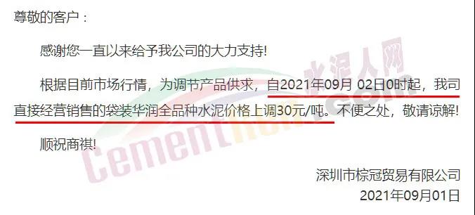 深圳市棕冠貿(mào)易有限公司通知,根據(jù)目前市場行情,為調(diào)節(jié)產(chǎn)品供求,自2021年9月2日0時起,公司直接經(jīng)營銷售的袋裝華潤全品種水泥價格上調(diào)30元/噸。