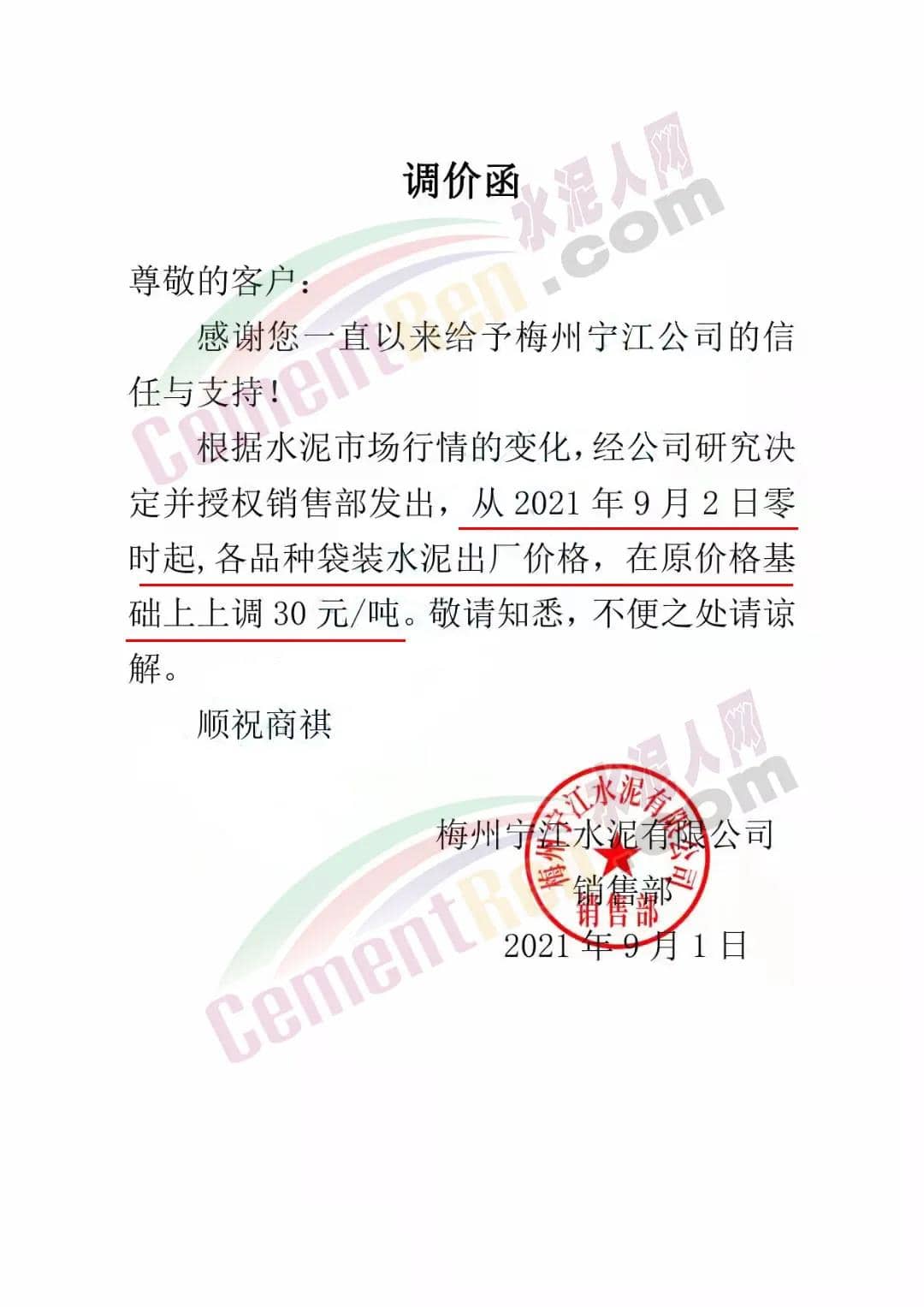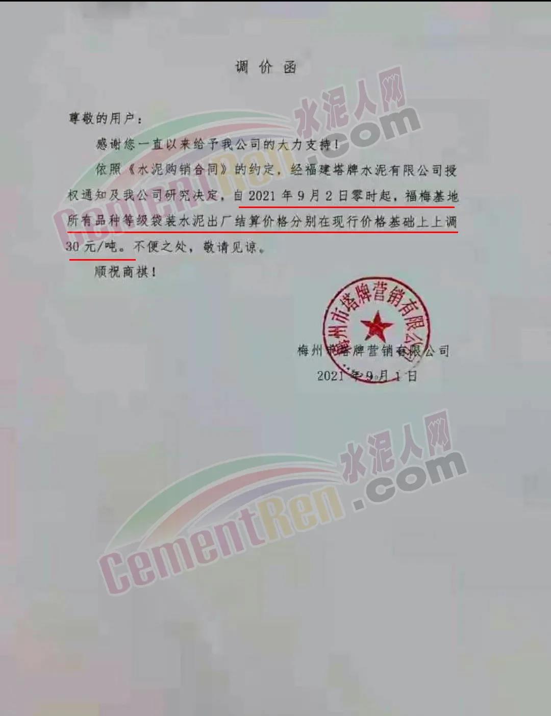 梅州寧江水泥有限公司通知,根據(jù)水泥市場行情的變化,經(jīng)公司研究決定并授權(quán)銷售部發(fā)出,從 2021年9月2日零時起,各品種袋裝水泥出廠價格,在原價格基礎(chǔ)上上調(diào)30 元/噸。