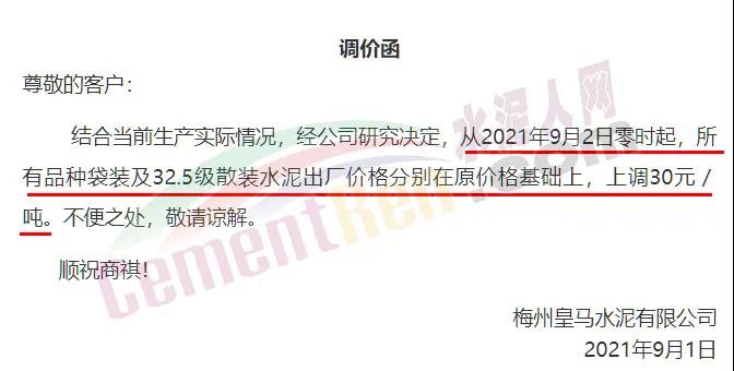 梅州皇馬水泥有限公司通知,從2021年9月2日零時起,所有品種袋裝及32.5級散裝水泥出廠價格分別在原價格基礎(chǔ)上上調(diào)30元/噸。