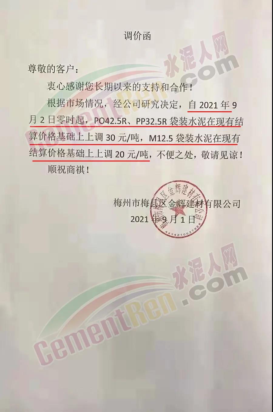 梅州市梅縣區(qū)金輝建材有限公司通知,自2021年9月2日零時起,PO42.5R、PP32.5R袋裝水泥在現(xiàn)有結(jié)算價格基礎(chǔ)上上調(diào)30元/噸,M12.5 袋裝水泥在現(xiàn)有結(jié)算價格基礎(chǔ)上上調(diào) 20 元/噸。